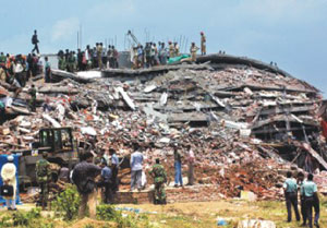 Latest reports are that 89 people were pulled out alive from underneath the rubble of the building, located in the industrial town of Savar, about 30 km northwest of Dhaka. The building housed Spectrum Sweater Industries Ltd. and Shahriar Fabrics. At the time of the collapse, approximately 00:45 a.m. on April 11 some 450 workers were reportedly working the night shift on three floors of the building, according to The Daily Star.
