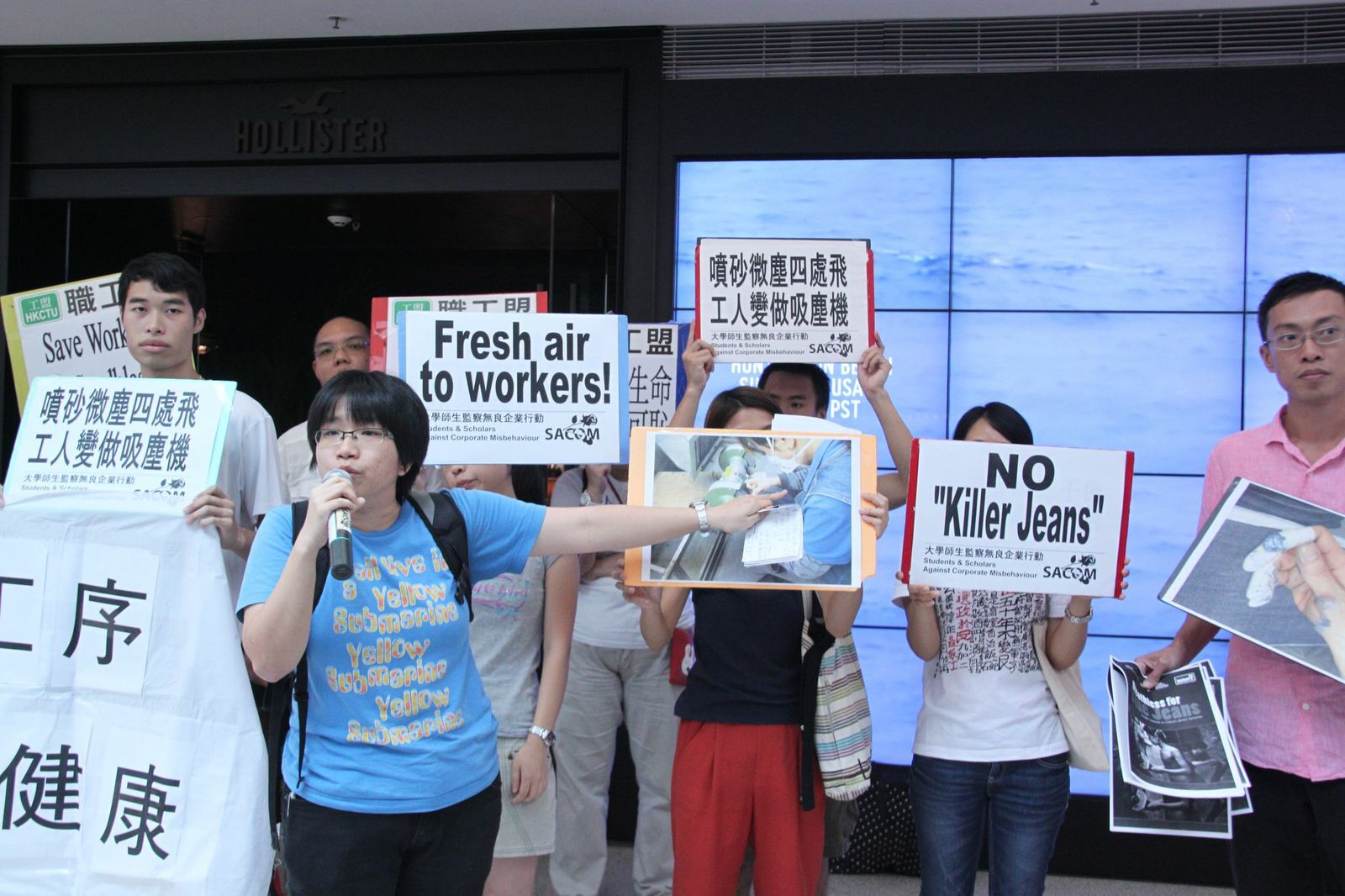 Campaigners from groups including Scholars and Students against Corporate Misbehaviour (SACOM), ITUC/GUF Hong Kong Liaison Office (IHLO), Hong Kong Confederation of Trade Unions, Globalization Monitor and members of the Socialist Party from Malaysia called on Hollister and other major brands to make public details of how they implement the voluntary ban on the deadly use of sandblasting and called on them to support mandatory bans worldwide to put an end to sandblasting once and for all.